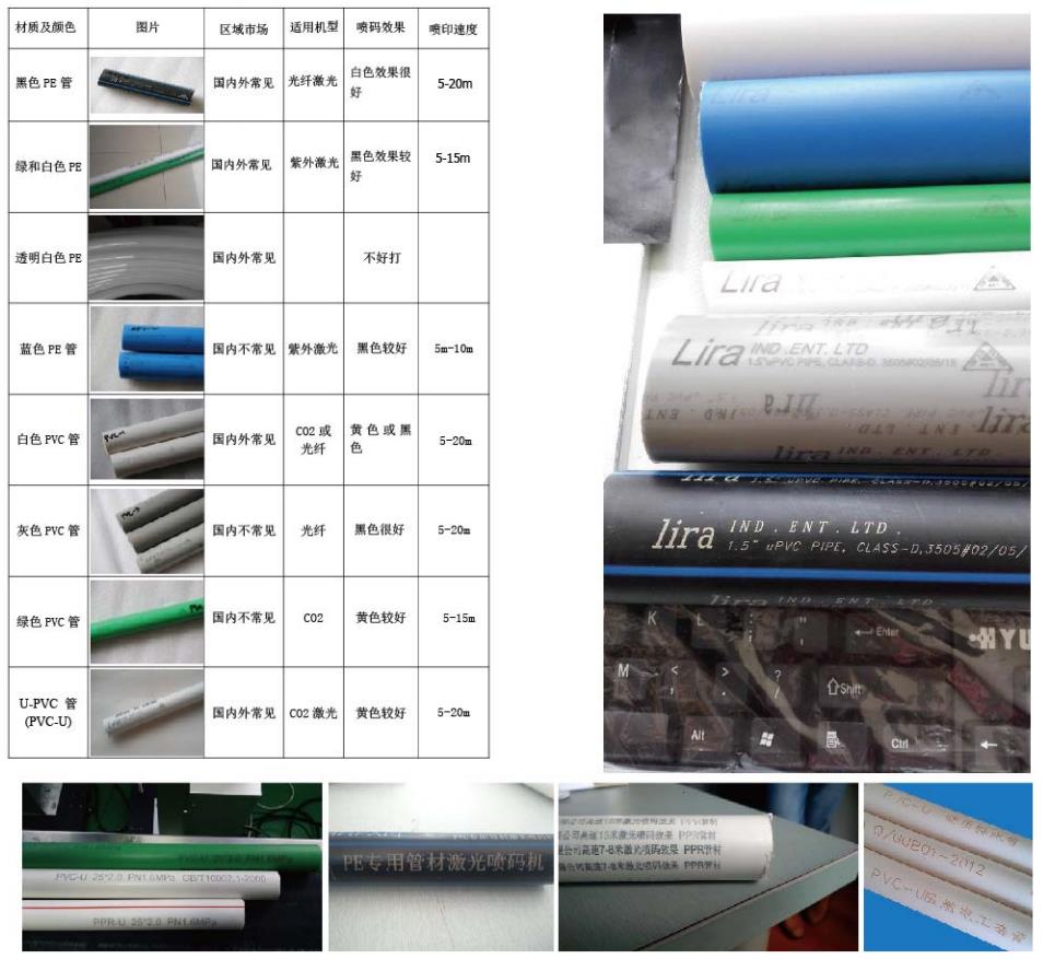 管材分类:PPR {无规共聚聚丙烯管)、PVC (聚氣乙烯)、UPVC (硬聚氧乙烯)、PE、PE-RT、PB等。市面上销售的苷材顔色主要 有白色、黑色、灰色、蓝色、绿色、黄色、透明色,这些顔色的管材多数可采用激光打标机进行打标、喷码。